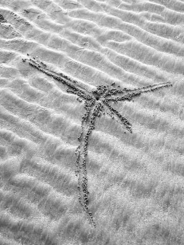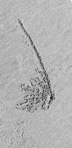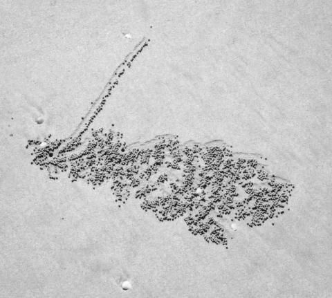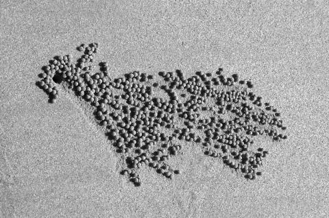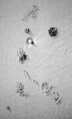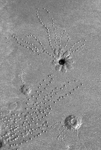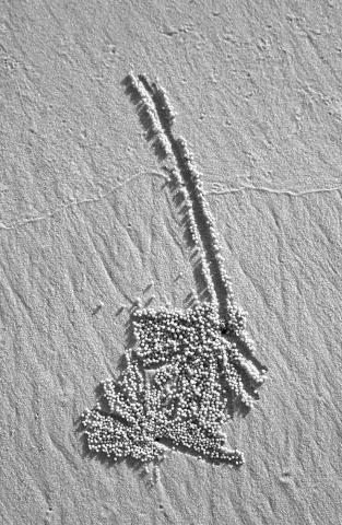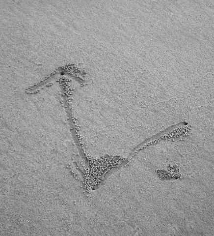 In the center you can see one of our tiny zen artists: a Thai Bubble Crab. They are about 2-3mm in diameter. They make the balls as they feed off of the algea attached to individual grains of sand. When the ball (or sand bubble) gets too big to sit on, they roll it to one side and start over again... creating the most fantastic sandpaintings as they lunch away the day.