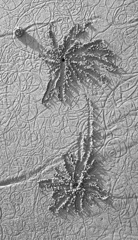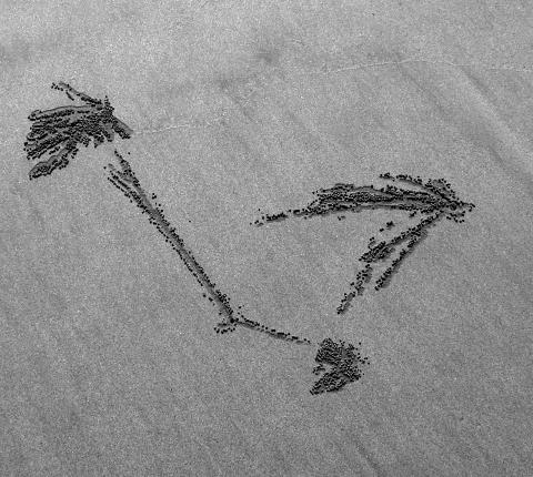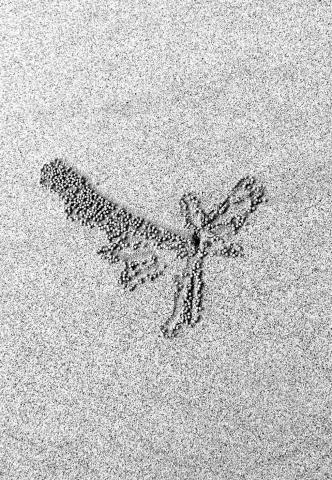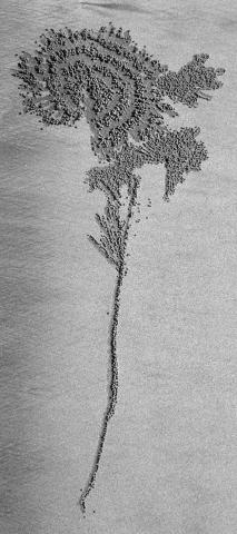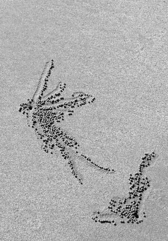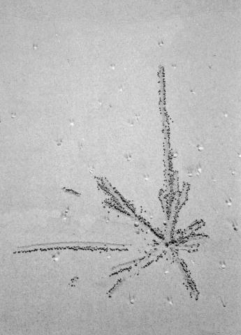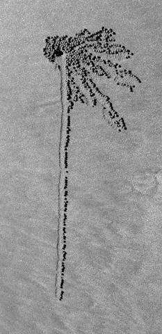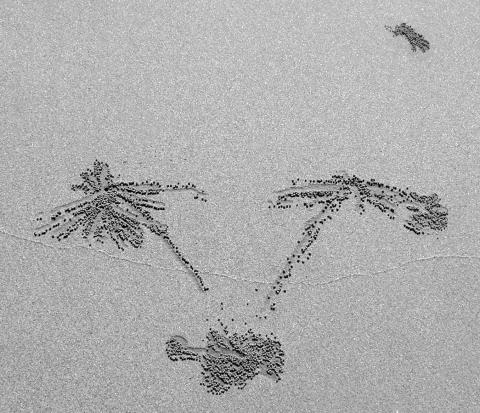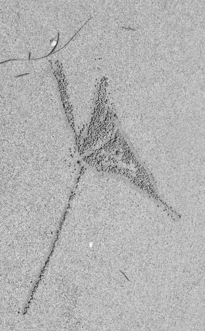 Frequently I was working in and around a day's worth of human, canine and bicycle tracks. Which raises a delicate issue: should I "restore" a sandpainting by removing said tracks (via photoshop)? -- or should I simply smile as nature shows us yet another way of "renewing the canvas"?