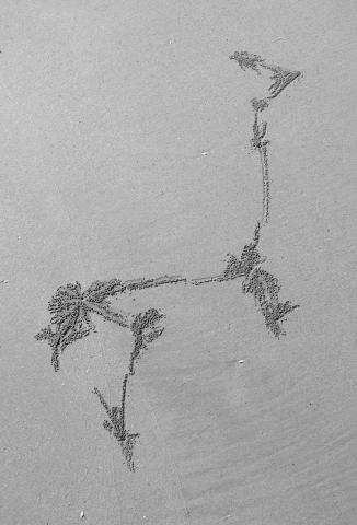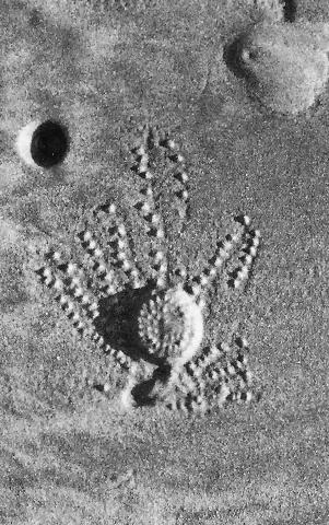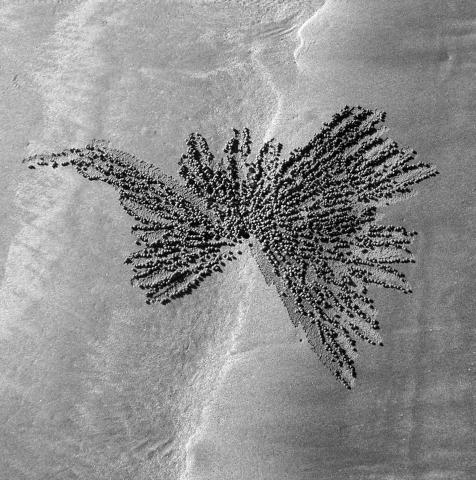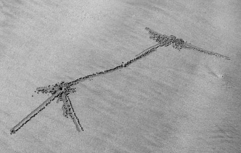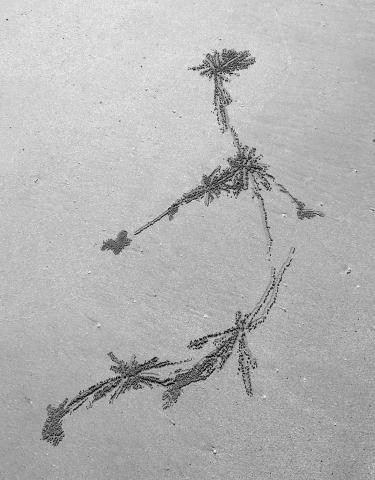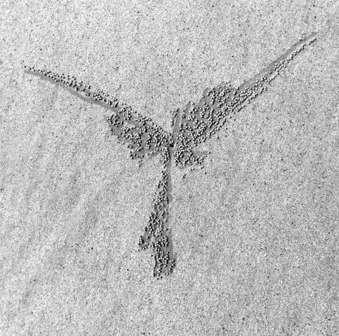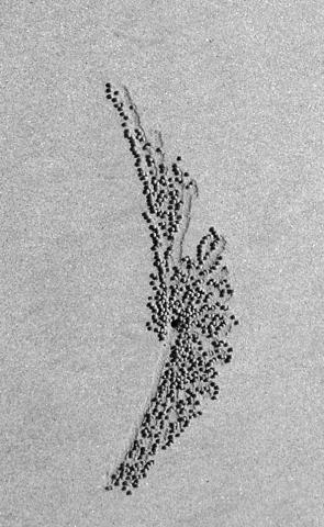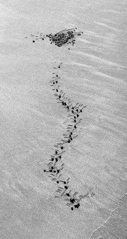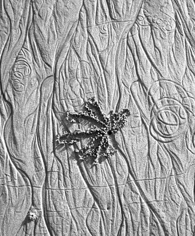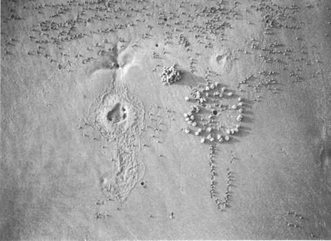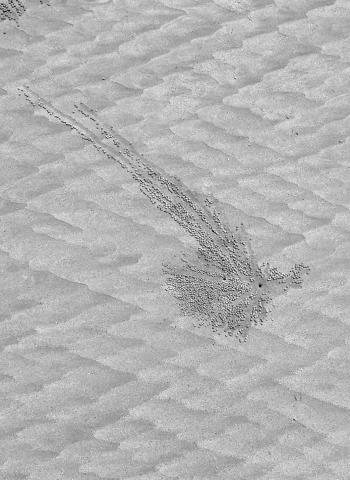 Frequently I was working in and around a day's worth of human, canine and bicycle tracks. Which raises a delicate issue: should I "restore" a sandpainting by removing said tracks (via photoshop)? -- or should I simply smile as nature shows us yet another way of "renewing the canvas"?