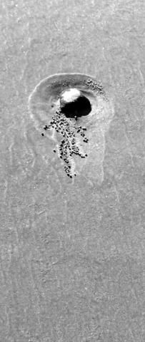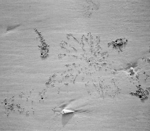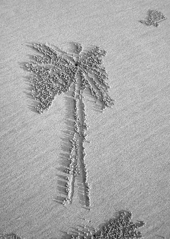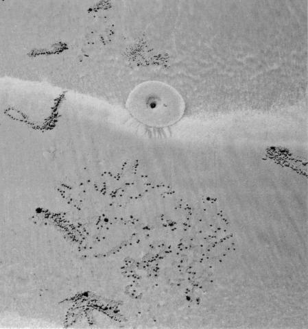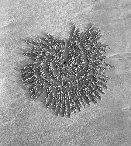 In the center you can see one of our tiny zen artists: a Thai Bubble Crab. They are about 2-3mm in diameter. They make the balls as they feed off of the algea attached to individual grains of sand. When the ball (or sand bubble) gets too big to sit on, they roll it to one side and start over again... creating the most fantastic sandpaintings as they lunch away the day.